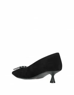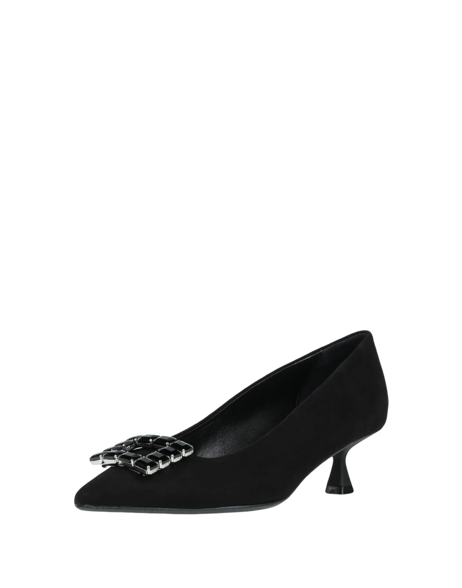 suede effect, rhinestones, solid colour with appliqués, leather backing, narrow toeline, spool heel, rubber sole, contains non-textile parts of animal origin